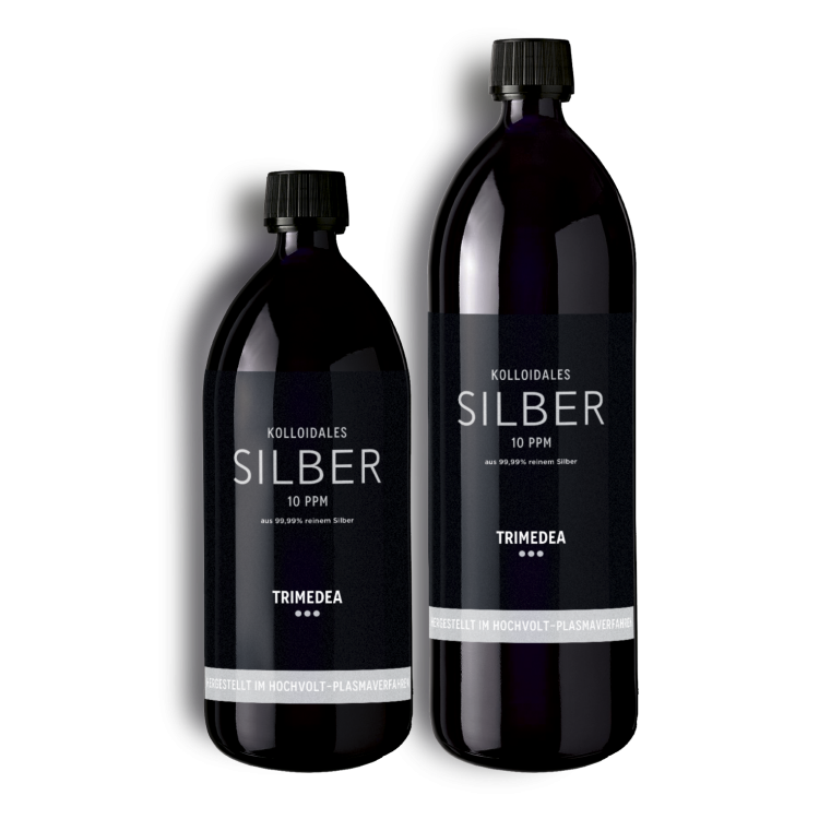 Kolloidales Silber von Trimedea erhalten Sie in Violettglasflaschen in drei Größen: 100 ml (Sprühflasche), 500 ml und 1000 ml.